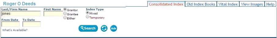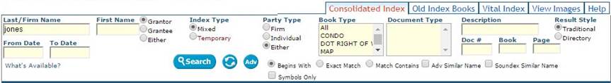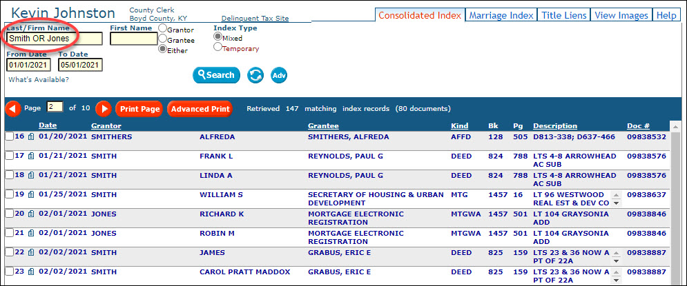 In the Consolidated Index, you can search for multiple names by using "OR" in the Last/Firm Name or First Name fields. Example: Searching "Smith OR Jones" will return search results containing both.