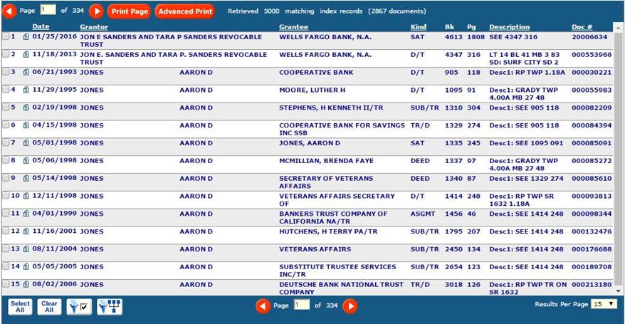 ·         Choose Result Style - If you prefer, you may change you search “Results Style” to “Directory” as an Advanced Search criteria.  This option groups all search results by unique Party name and shows the number of records for each name.  To drill down to view the individual records for a name double-click the name or select a name and press enter.  To return to the Directory from the individual records, use the “Show Dir” button.