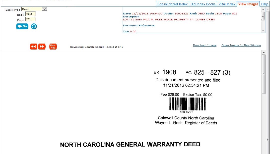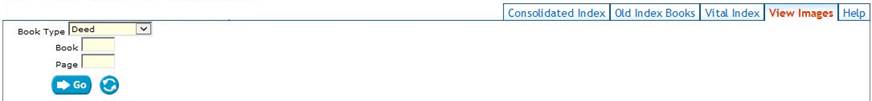 If you know a book and page for a document that you wish to view you can go directly to the image. To do this click on the “View Images” tab. Select your book type, enter a book number and a page number, and then click the Go button. Your image will be displayed. If it is an image that has computerized index data available, the index data will be displayed above the image.