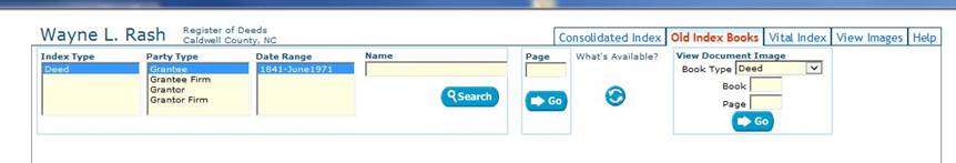 To find documents which have not been digitally indexed, you can use the Old Index Books tab, (where avaialble). Select the document type, party type, date range, and enter a full or partial name, then press "Search". The resulting image shows a list of names according to your search. If the exact name is not displayed, you can use the navigation arrows to locate the image with your target name. This "initial index page" image details the page of the index where the specific document's book & page is detailed. Now enter the listed page and press "Go". Scroll to your search name to find the book & page, then move to the "View Images" tab and enter the book type, book number and page, and press "Go" to display your document.