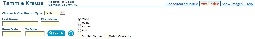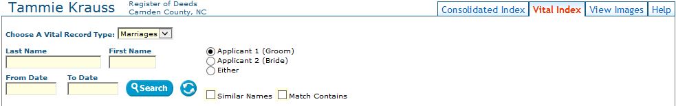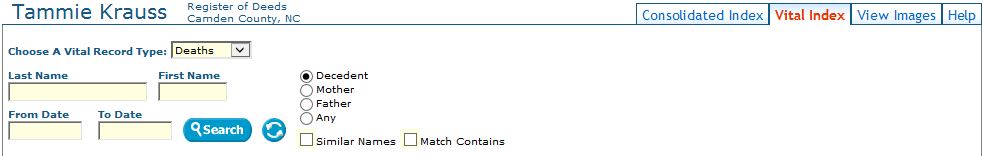 The Vital Record Search functionality is found under the “Vital Records” tab. Only permanent records are displayed. If a record is temporary (i.e. a very recent record that is still in the indexing workflow) it will not be displayed. To search the vital records index you need to choose between searching Birth, Death, or Marriage, records. Otherwise, the search functionality is just like searching the Land Records. Images are available for Death certificates and Marriage Licenses.